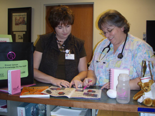 Stephanie Wagner (l) and Shari Kuther, RN, look at