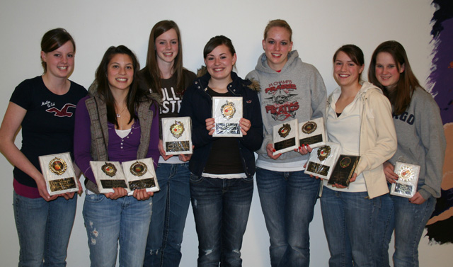 The girls basketball awards were given out last Tuesday. From left are NaTosha Schaeffer, co-captain; Amber Holthaus, co-captain and most inspirational; MaKayla Schaeffer, 6th man; Meaghan Bruner, most improved; Mary Shears, co-captain and co-MVP; Megan Sigler, co-MVP and co-Pirate Award and Betty Clark, Stats. Photo by Michelle Schaeffer. JV and C team award winners are shown for the Prairie girls basketball tea,. From left are Claire Whitley, C team co-MVP; Kendal Schumacher, JV-most inspirational and co-Pirate award; Hope Vanator, C team co-MVP; Tanna Schlader and Callie Mader, JV co-MVPs; Shelby VonBargen, co-Pirate award and JV most improved; and Amanda Dinning, C team most improved. Not shown is C team most inspirational Cheryl Gehring. Photo by Michelle Schaeffer. PRAIRIE SOFTBALL 2010 March 22-at Lapwai, 4 p.m. 25-Timberline, here 4 p.m. 26-at Orofino, 4:30 p.m. 17-Troy, here, 2 league, 11 a.m. 19-at Grangeville, 4 p.m. 20-Lapwai, here, 4 p.m. 22-Genesee, here, 4 p.m. 26-at Timberline, Frazier Park, 4:30 p.m. 27-Lewis County, here, 4 p.m. 29-Grangeville, here, 4 p.m. 4-at Genesee, Airport Park, Lewiston, 4:45 p.m. 6-Orofino, here, 4 p.m. 10-at Kendrick, 2 league, 4 p.m. 14-15-District at Cottonwood 21-22-State at Caldwell |