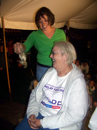 cuts Judy Salisbury’s hair at the American Cancer Society’s Relay for Life