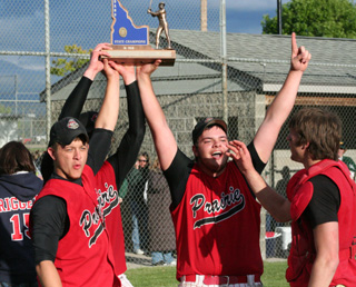 and Joe Schumacher hold the state chmapionship baseball trophy aloft so