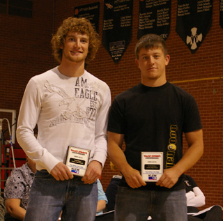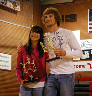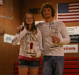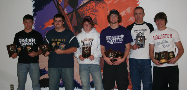 Awards night for the 2010 1-A State Baseball champions was Wednesday, May 26. From left are Kyle Holthaus, co-captain, 4-year player and Most Hits (29); Joe Schumacher, co-captain, 4-year player and highest on-base percentage (.675); Troy Lorentz, co-most walks (20); David Sigler, co-captain, Most RBI (33), Highest Batting Average (.413), Highest Slugging Percentage (.714); Devin Schmidt, Most Runs (33) and Conner Rieman, co-captain, 4-year player and co-Most Walks (20). Receiving Taco John Student Athlete awards were David Sigler and Kyle Holthaus. NaTosha Schaeffer and David Sigler were named Queen and King of Sports at the awards assembly last week. Amber Holthaus and David Sigler were named Athletes of the Year. |