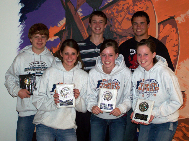 Shown are the PHS Track award winners. Back from left are Brock Heath, boys running athlete of the year; Kade Perrin, boys rookie of the year and Kyler Shumway, boys field athlete of the year. Front from left are Shelby VonBargen, girls rookie of the year; MaKayla Schaeffer, girls field athlete of the year and NaTosha Schaeffer, girls running athlete of the year. Photo provided by Ryan Hasselstrom. |
