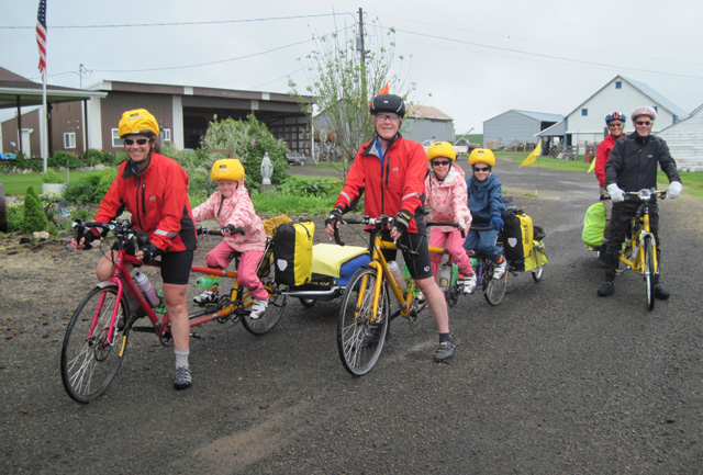 A group of people bicycling from Portland, Oregon to Washington D.C. stopped
