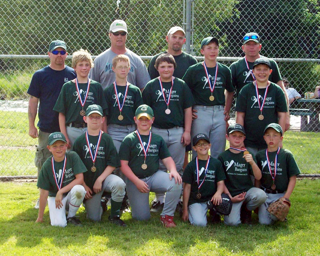The Mager Bargains Little League team took third place in the league tournament this past weekend at Kooskia. Front from left: Jacob Stubbers, Devin Bruegeman, Derek Arnzen, Drew Dinning, Nicholas Mager, Shawn Spencer. Middle: Daniel Mager, Victor Schmidt, A.J. Everson, Peter Spencer, Jordan Bowles. Back: Asst. Coaches Kert Schmidt, Branden Arnzen and Neil Bruegeman and head coach John Mager. |
