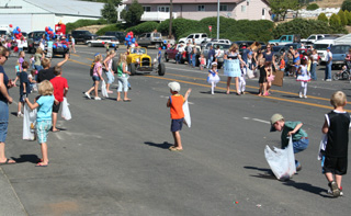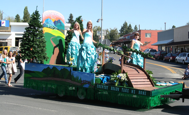 The 2010 Idaho County Fair Parade was a success; there were 38 entries varying from royalty to miniature horses to 4-H groups. The Fair Board would like to thank everyone who entered the parade and also everyone who helped to make it a success; including the Hang Out for allowing the parade to use their parking lot for the line up, Collette Schaeffer for helping with the sign in, Pat and Ed Holthaus for helping with the line-up, Joe Seubert for announcing, the Lion’s Club for the use of their sound system, Hoene Hardware for letting us hook up the sound system in front of their store, and a special thanks to Bud’s Saw Service for loaning out two of their Rangers for the Fair Board to ride in and to Shelia Deweese for driving the Grand Marshal, Lauretta Crabtree, in her Mustang convertible. The Fair Board would also like to thank the parade judges who will remain anonymous. The winners of the parade are as follows: Commercial: 1st-Cottonwood Credit Union; 2nd-US Bank; 3rd-Photography by Rene Non-Profit: 1st-Color Guard and National Guard; 2nd-Keuterville Livestock; 3rd-Indoor/Outdoor 4-H Club Royalty: 1st-Lewis County; 2nd-Idaho County; 3rd-Lewiston Roundup Equestrian: 1st-Mini Whinnies; 2nd-Lewiston Roundup Stagecoach Best of Show: The Color Guard and National Guard The VFW/American Legion Color Guard along with the National Guard entry following them were judged Best of Show in the Fair Parade. The Idaho County Fair Parade was the final official appearance for the 2010 Royalty. Walking behind the float and tossing candy to the crowd were the 2011 Royalty. The Lewis County Royalty float was the parade winner in the royalty category. The Keuterville Livestock 4-H Club float. The Cat in the Hat made an appearance at the parade as part of the Prairie community Library entry. The Tidwell-Uhlorn mini-horse entry is always a popular one in the Fair parade.