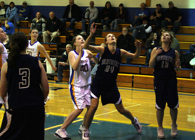 Savanah Prigge and Rachel Wemhoff watch the ball and look to rebound. At left is Nicole Frei. Summit fell behind early but rallied to make it a close game before losing by just 1 point at Nezperce Tuesday, Dec. 23. Rachel Wemhoff, 13, and Brooke Schumacher watch as a teammate goes after a loose ball in the game at Nezperce. Photos contibuted by Lewis County Herald editor Steve Wherry. Summit Academy Basketball Schedule 2010-2011 December 4-Girls vs. CV, here 7-Girls at Troy* 9-Girls at Lapwai* 10-11-Boys at New Meadows Tourney 14-Girls vs Culdesac, here** 15-Girls & Boys at Salmon River, V only, girls 6 p.m. MST, boys follow 16-Boys at Potlatch* 21-Boys at Grangeville 6-Boys vs Timberline, here** 7-Boys vs Troy, here* 8-Girls vs Nezperce, here** 11-Girls at CV* 13-Girls vs. Potlatch, here* 14-Boys at Highland** 15-Boys at Nezperce** 18-Boys vs. Prairie, here* 20-Girls at Culdesac** 21-Boys vs. Lapwai, home* 22-Boys at Logos, 3 p.m. 22-Girls at Deary* 25-Girls vs. Timberline, here** 27-Boys at Genesee 28-Boys and Girls at Orofino, V only 29-Boys vs. Kendrick, here* 3-Boys vs. Nezperce, here** 4-Boys vs. Highland, here** 8-Boys vs. Deary, here* *White Pine League game **WPL Division II league game Girls V & JV unless indicated, Boys are V only. Girls JV starts at 6 p.m., varsity at 7:30 unless indicated. Boys are varsity only at 7 p.m. Sites for some home games still to be determined. |
