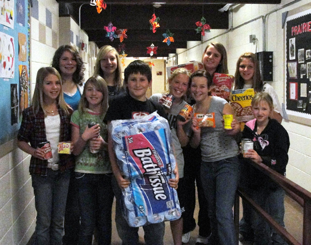 Students from Prairie High School are learning one of the best lessons in life. They are lending a helping hand to their neighbors in need this holiday season. Through their efforts over 1,800 pounds of food and $1500.00 was raised locally for the St. Mary’s Hospital Food Bank. Close to $4000 in proceeds from the Idaho County Shootout, a basketball fundraiser with Grangeville High School co-sponsored by the Idaho County Sheriff’s Department, is earmarked for local food banks. Inland Cellular contributed $150 to each school and students sold signed basketballs to supplement proceeds from the admission fee. Although GHS won the competition on the court, the PHS students were winners, too, when they augmented those funds with a fund drive of their own. Text messages, in-school signs, intercom announcements and even door to door solicitations helped raise additional funds and food. Cassie Weightman, PHS student, dedicated herself to the effort and raised about $350 for the holiday food boxes destined to over 56 families in need. The PHS food drive was coordinated by the Health Occupations Student Association members. The HOSA students prodded their classmates to bring nonperishable food to school each day. Darby Duclos, PHS teacher, appealed to the students’ competitive nature by offering to treat the class that raised the most to a pizza party. The junior class edged the seniors by only a half point. “The students deserve a huge pat on the back for recognizing that food can cost a lot of money and not everyone has enough,” said Zara Hasselstrom, Director of the St. Mary’s Food Bank. “I’ve volunteered at the food bank for the past four years and each year the number of people who need our services increases. That’s the bad news, but the good news is that we have more food on our shelves right now than we have ever had. Thanks to the kids and to other generous people in our community.” According to Hasselstrom, some of the money raised will be used to purchase turkeys or hams to place in the holiday food boxes. “Even without asking, seven people, so far, have asked Reiner’s Grocery to set aside a turkey for the food bank then paid for it themselves. That proves we live in a community where people are concerned about others who may have had a difficult year.” She also said Ron and Debbie Snyder, owners of the Hangout restaurant, are among those whose generosity is greatly appreciated. “They hosted a free Thanksgiving Dinner for anyone who wanted to come, but a number of people insisted on paying so they donated that $385 to our food bank.” Anyone interested in donating nonperishable food can drop it off at the reception desk at St. Mary’s Hospital. Financial donations can be sent to SMHC, PO Box 137, Cottonwood, Idaho 83522. Checks should be made out to SMHC Food Bank. “Before dropping off food, please make sure it is before the expiration date. Our foodbank complies with state regulations and I check the dates of every item before putting it on the shelves,” said Hasselstrom. Families in need can contact Stacie Jackson, SMHC Mission Services committee member, if they would like to be confidentially included in the Angel Tree Project to receive gifts for children and/or a food basket from the food bank. She can be reached at SMHC’s Cottonwood Clinic, 962-3267. The HOSA students and their classmates will be helping pack the family Christmas boxes and assisting with their deliveries. “We really rely on the kids to help and their hearts are always in the right place,” said Hasselstrom. Prairie Elementary School students with the food items they gathered. Prairie Middle School students with some of the items they collected in the food drive. Katherine Nida and D.J. Walker with food gathered in the high school food drive. |