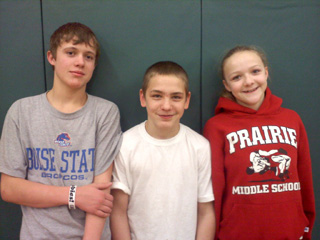 Hunter McWilliams took first place in the 106 lb. weight class at the Junior High Wrestling Tournament at Potlatch Saturday, Feb. 5 while Kellie Heitman took third in the 100 lb. class. Kellie Heitman, 100 lbs., pinned Jody Dykes of Sacajawea, pinned Brandon Miller of Potlatch, lost to Robert Huen of Kamiah 8-9, lost by pin to Tyler Schwartz of Orofino and pinned Trae Dominguez of C.V. to finish in 3rd place. Hunter McWilliams, 106 lbs., pinned Jeff Berger of Sacajawea, pinned Terry McDonald of Grangeville, pinned Clint Ponozzo of Sacajawea, pinned Isaac James of C.V. and pinned Kyle Cutting of Moscow to finish in 1st place. Dally Ratcliff lost to Zack Wilkens of Kamiah 5-9, pinned Preston Hogaboam of Potlatch. pinned Amir Rezmond of Moscow, lost by pin to Drake Randall of Sacajawea and lost to Pedro Hernandez of Moscow 10-12 in overtime. The team placed 6th out of 8 schools: 1st Sac, 2nd Mos., 3rd Kam., 4th Pot., 5th C.V., 6th Prairie, 7th Grangeville and 8th Orofino. Prairie junior high wrestlers at the Potlatch Tournament. From left are Dally Ratcliff, Hunter McWilliams and Kellie Heitman. Photo provided by Jennifer Heitman. FEBRUARY 25-26-State at Nampa |