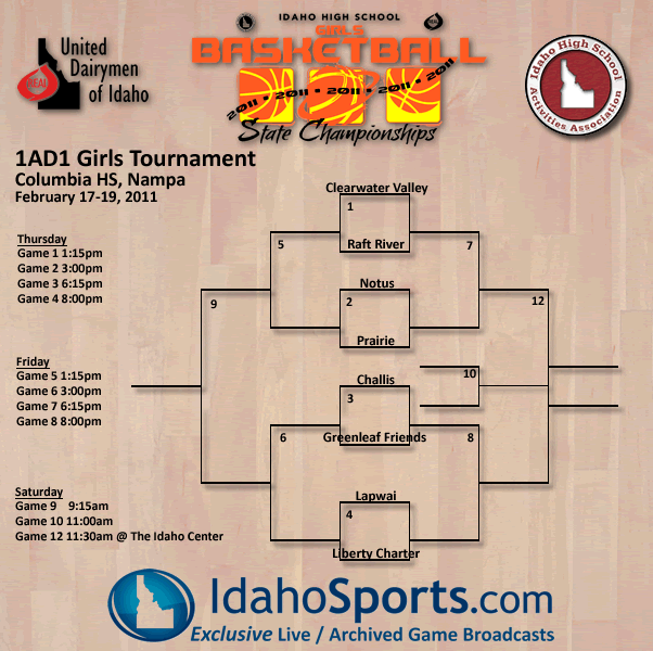 Shown above is the state tournament bracket. All times shown are MST. PIRATES GIRLS BASKETBALL SCHEDULE FOR 2010-11 *indicates league game 16-Culdesac, here, postponed due to power outage to Jan. 27 18-Grangeville, here, lost 26-61 22-Orofino, here, postponed due to weather to January 3 23-Kamiah, here, lost 39-40 29-Culdesac, there, won 67-18 30-Lapwai, here*, lost 33-75 4-Genesee, there, 1 p.m., won 56-31 7-Deary here*, won 50-22 9-Nezperce, here, lost 44-37 13-Timberline, there (schedule change), won 51-37 17-Kendrick, there*, won 58-51 in double overtime 4-Summit, here, lost 36-50 10-Orofino, there, see note above 13-C.V., here*, lost 48-60 15-Potlatch, there, 1 p.m.*, won 53-22 18-Lewiston JV here, varsity only, 6 p.m., won 62-51 22-Genesee, here, 1 p.m.*, won 64-14 24-Kamiah, there, lost 41-46 25-Troy, there*, won 60-40 27-Culdesac, here won 76-22 Feb 2, 5, 7 & 9-District at LCSC-defeated Deary 63-34, lost to CV 35-51, defeated Troy 61-48, defeated Kendrick 45-37 Feb. 12-State Play-In game at St. Maries, 6 p.m.-will play District 1 champion Lakeside for a berth in State Tournament. Won 42-25 Feb. 17-19-State at Nampa, Play Notus at 2:00 p.m. PST. |