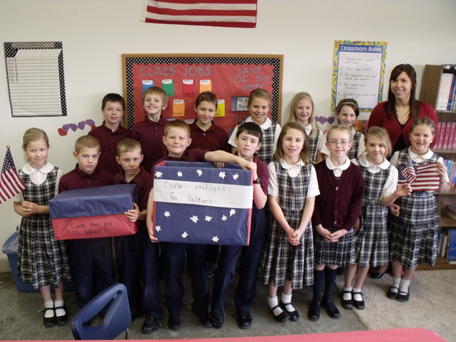 Shown is the 1A, Division 2 state bracket. All times shown are MST. Summit boys lose season finale Playing one of their better games of the season last week, Summit’s boys nevertheless endured another loss to finish their current season with a record of 2 and 18, putting them in fourth position in Division II District competition. Their 49-58 loss to Deary at Highland’s gym left the Patriots with a White Pine record of 0-11, and their six losses to Nezperce, Highland and Timberline pairs them with Division II league champ Nezperce next Monday afternoon at the LCSC Activity Center. In the Deary game, the Patriots canned five of their first quarter shots taken to move out to a 16-12 lead at the end of the period. The second quarter however, proved to be a complete turnaround as only 1 of 16 shots fell for the local boys, putting them behind 19-30 at the halftime break. The second half proved to be a bit kinder for Summit however, as they outscored the visiting Mustangs 30-28 over the last half of the game. Scoring and rebounding for the Patriots: Derek Nuxoll 4 and 11, Shane Stubbers 9 and 7, Dan Wemhoff 0 and 0, Austin Chmelik 24 and 4, including 3 of 6 from 3-point range, David Waters 3 and 8, brother Michael Waters 9 and 5 and Matthew Schwartz 0 and 2. Chmelik handed out 3 assists during the game and recorded 2 steals, while Stubbers with 4 led the Patriots in the theft department. For the game the Patriots hit 15 of 46 attempts from the field for 33%, but could net only 7 of 19 at the line, a lowly 37% in that area. David Waters added one more three to the Summit total, leaving the team with a 29% effort from there on 4 of 14 shooting. With the exception of the second quarter, the Patriots actually outscored the Tigers in three of the other quarters played, but the 3 to 18 deficit which occurred in the second stanza proved to be too much to overcome. Summit 3rd-4th to make care packages for soldiers Deodorant, shampoo, gum and granola bars. These may not be the traditional Valentine’s Day items you would give to the ones you love. To the 3rd and 4th grade students at Summit Academy, these are the gifts they will be giving this Valentine’s Day. Last week, these students kicked off their fundraiser and collection of items for soldiers serving overseas. The students are gathering a variety of supplies to fill care packages which will be sent to soldiers who are currently deployed. The 3rd and 4th grade students created this project as a way to help the men and women who are sacrificing their lives to protect our freedom. When asked why she is bringing in items, third grade student Jessie Sonnen replied “We are sending care packages so we can help the soldiers like they have helped us”. The 3rd and 4th grade students have asked the staff and student body at Summit Academy to help with their project, and would also like to ask the community’s support in their efforts. If you would like to help out with this project, items and cards will be collected until April 22; donations can be dropped off at the Summit Academy office. A list of needed items can be found below. Homemade cards or letters expressing your gratitude are greatly appreciated as well. Care Packages for Soldiers: Items Needed Food: Powdered drink mixes, Cookies, crackers, pretzels (snack size), Tuna in a pouch, Beef, chicken or turkey jerky, Cheese spread (no aerosol cans), Ramen noodles, Snack cakes, Gum, Nuts, Granola bars, Pop tarts, Dried fruit, Trail mix, Red licorice twists, Tootsie rolls, Wheat thins, Canned meats (no pork products), Hard candy (individually wrapped) Hygiene Items: Lip balm, T-shirts- solid grey or black (L or XL), Lotion, Bug repellent, Shampoo, Soap, Slippers Miss Crocker and her 3rd/4th graders, holding their boxes for our troops. Summit Academy Basketball Schedule 2010-2011 Feb. 21-Summit boys vs. Nezperce at District at LCSC, 3:30 p.m. Feb. 22, 24, 25-Boys district continues |