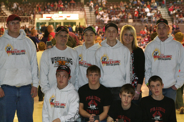 The Prairie Wrestling team at the Idaho Center after the awards ceremonies. Back from left are Mitch Arnzen, head coach Dan Altman, Tyler Ross, Tayler Heitman, stats keeper Tannor Ratcliff and assistant coach Chris Altman. Front from left are Garrett Schmidt, Damian McWilliams, Alex Duman and Kade Perrin. Duman earned a 3rd place medal, Perrin a 5th place medal and Ross and McWilliams a 6th place medal each. Jungert finished tied for 7th, 1 win short of earning a medal while Heitman was two wins short. |