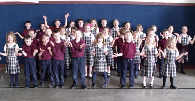 Where your Treasure is, there will your Heart be also The 2011 spring show/open house this year at Summit Academy will center around the theme “Where your treasure is, there will your heart be also.” On Thursday evening, March 17th at 7:00 pm in the Summit multi-purpose room all are welcome to attend. This opportunity is for family, friends and all those interested to come join a night of entertainment with the students of Summit Academy. Each class will be showcasing their talent with a presentation focused on the theme. The variety ranges from a young group of shipwrecked pirates, to talented singers, to a group of leprechauns, to choral reading, etc. with music and recitation all in the mix. Classrooms will be open as well, complete with student work on display for people to see what is happening within Summit Academy. Finally, there will be refreshments for all to enjoy at the end of the evening. We hope you will come and celebrate with us the feast of St. Patrick’s Day! These youngsters will begin the night with the song "Welcome to Our School" during the spring show at Summit Academy. |