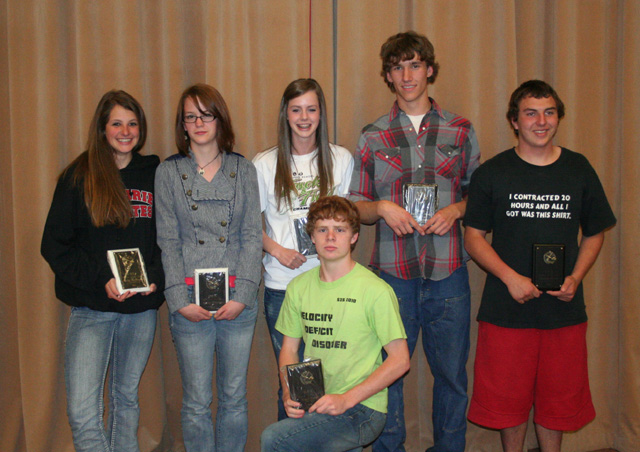 PHS track award winners are shown. In front is Brock Heath, boys runner of the year. Standing from left are Shelby VonBargen, girls runner of the year; Claire Whitley, girls rookie of the year; MaKayla Schaeffer, girls field athlete of the year; Justin Schmidt, boys field athlete of the year and Dakota Wilson, boys rookie of the year. The track team held their awards banquet at the Middle School cafeteria Thursday, June 2. |