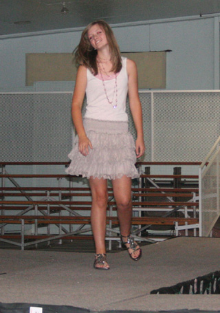 Fashion Board member Monica Lustig helps a young Cloverbud