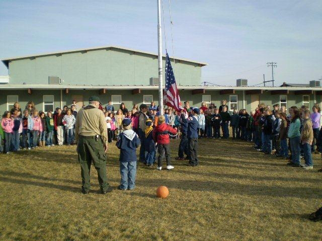 and parents gathered around the flag pole as caller Zack Arnzen gave
