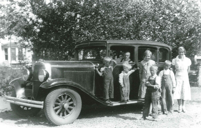 Frank Arnzen in his Desoto. From left are Maynard, Urban, Florence, Alvin, Francis and Regina.