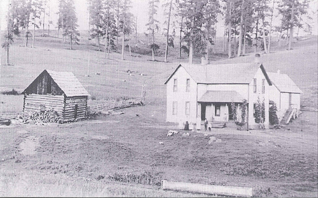 The Frank Enneking homestead on Deep Creek. At left is the first cabin they stayed in and at right the first house they built. Photo provided by Mrs. Ed Uptmor.