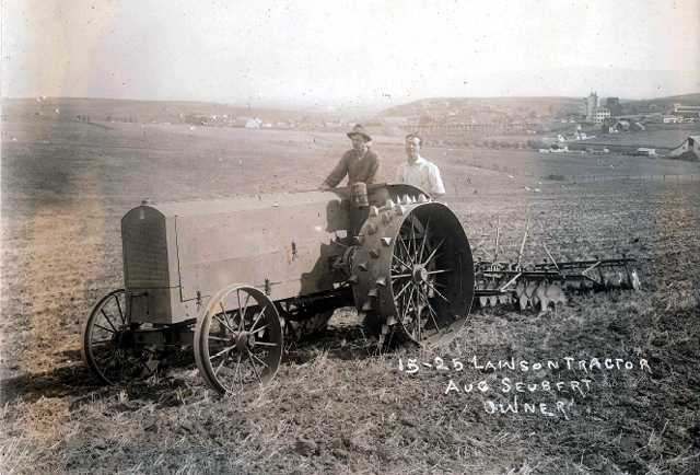 Gus Seubert and Frank Kelsey on a tractor tilling a field outside of Cottonwood. You can see the railroad trestle and Cottonwood in the background. Photo courtesy of Claudia Gehring. |
