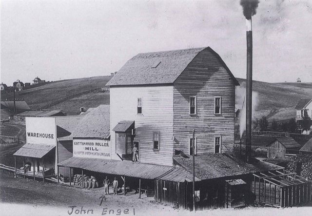 The Cottonwood Roller Mill in the early 1900’s. This was located where the Long’s Auto Sales site is now. John Engel, pointed out in the photo, was a steam engineer. Photo provided by Mrs. Ed Uptmor.