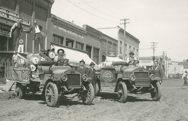 A couple of vintage GMC trucks unloading merchandise at Hoene Hardware on Main Street. The one on the right says Portland Cement. Photo courtesy of Claudia Gehring.