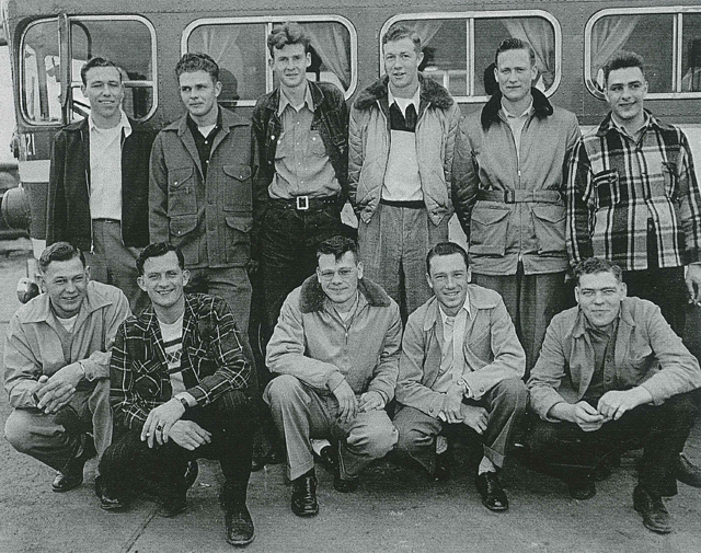 Several area young men heading into the armed services. Back row second from right is Bob Gehring and front row far right is Walt Wensman.