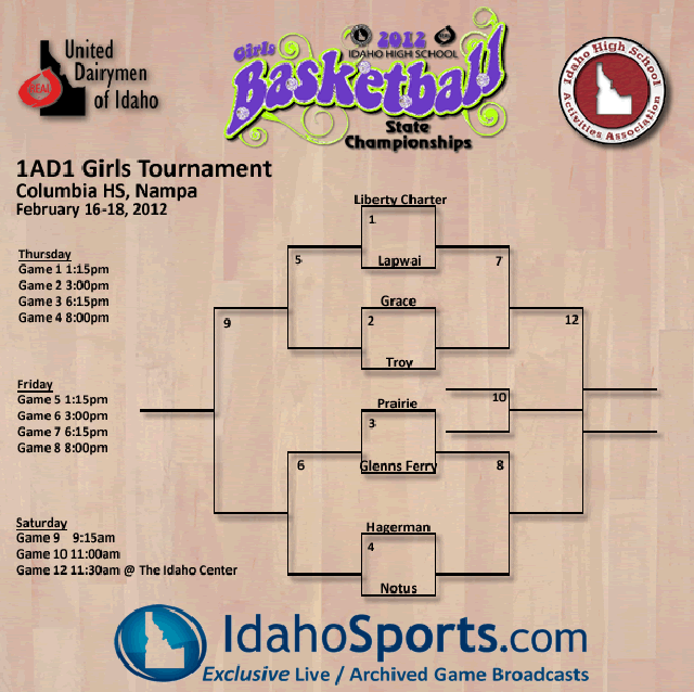 The state bracket. All times are MST. PIRATES GIRLS BASKETBALL SCHEDULE FOR 2011-12 *indicates league game 17-C.V, here, won 53-38 21-Kendrick, there--won 46-30 22-Troy, there, lost 45-54 28-Timberline, here, won 55-43 29-Potlatch, here*, won 45-12 6-C.V., there*, won 56-52 8-Genesee, there*, won 59-30 10-Kamiah, there, lost 41-52 12-Troy, here*, won 53-47 16-Grangeville, there, won 39-27 6-Lapwai, there*, lost 49-53 10-Deary, there*, won 38-17 13-Nezperce, there, won 55-38 20-Kamiah, here, lost 38-58 24-Summit, here, won 35-33 25-Kendrick, here*, won 58-39 Jan. 30, Feb 1, 3, 6 , 8 & 10-District at LCSC-defeated Deary 52-24 in District opener. Beat Troy 49-36. Beat Lapwai 51-41-District Champs!!! Feb. 16-18-State at Nampa's Columbia High School, Play Glenns Ferry at 5:15 p.m. PST at Columbia High School. See Bracket above. |