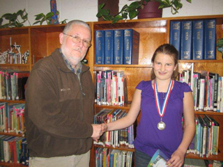District Spelling Bee. She is shown being congratulated by Greg Deiss.
