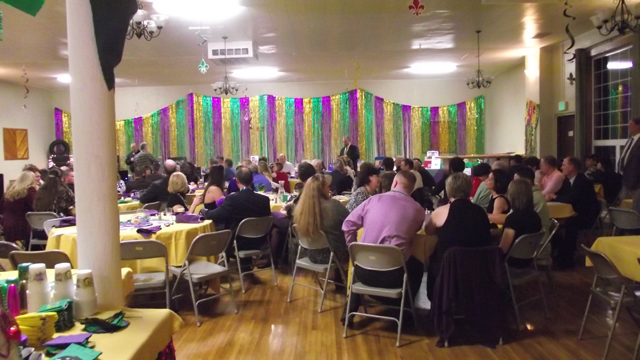 The crowd at the Hospital’s Mardi Gras event waits for auctioneer Dennis Rowland to auction off the next item