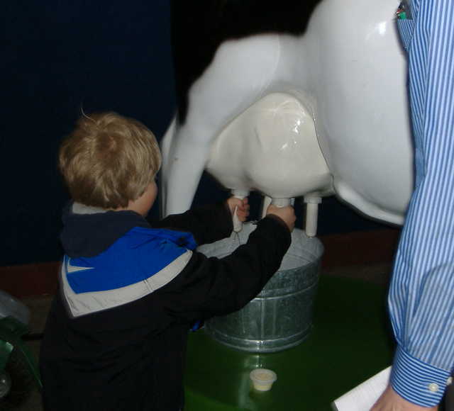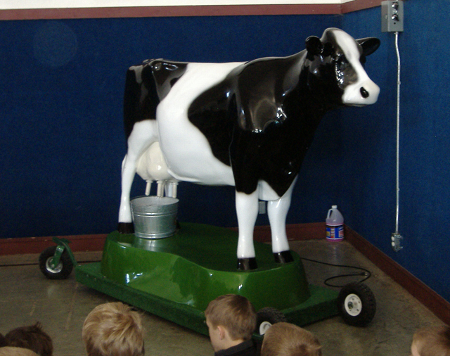 “Miss Maggie” the plastic cow is used to demonstrate how to milk a cow to school students. She has a pumping system that circulates the milk back into the cow.