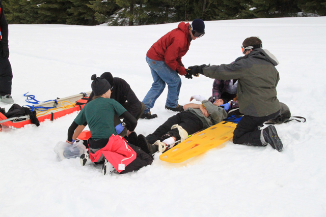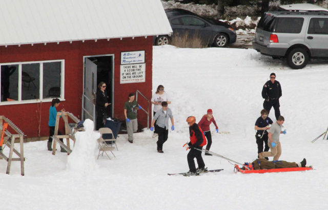 A disaster drill was held Saturday, March 24 at the Cottonwood Butte Ski Area. A group of about 30 first year medical students in the WWAMI program attending classes at Washington State University and the University of Idaho but part of the University of Washington School of Medicine, took part in the drill. Andrew Schweitzer, a former EMT in the local area, is one of the students and helped set things up. Taking part in the drill were Grangeville Mountain Rescue Unit, Cottonwood Butte Ski Area and Ski Patrol, Snowhaven Ski Patrol, St. Mary’s Hospital and Ambulance, the Cottonwood Police Department and Life Flight Network. The students spent Friday night at the Ski Area and did some first responder training and then applied that training on Saturday. The scenario was a plane crashing on the flat just prior to the final drop to the lodge on the ski hill. Approximately half the students made their way up from the bottom to find 12 “victims” with varying degrees and kinds of injuries. It was their job to triage the victims and get them safely transported to the lodge where additional care was done before transporting them out either by ambulance to St. Mary’s Hospital or by Life Flight Helicopter. One of the professors was asked to act as a lightly injured victim who is hysterical and gets in the way of those trying to help more severely injured victims. For those that were transferred by ambulance to St. Mary’s Hospital, the drill continued there at the emergency room. The “victim” that was loaded onto the Life Flight helicopter may have been a little disappointed that drill ended once he was loaded on as the helicopter then powered down. After the main drill was over the students received an additional training session with the crew of the Life Flight helicopter. All agreed that the drill went very well.