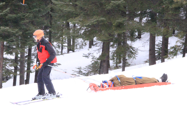 Once at the bottom of the hill the patient is taken into the ski lodge which has been turned into a makeshift emergency room.