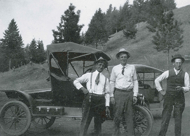 From left are Bill Kelsey, Hank Fay and John Hoene at Waha in 1914. Back then the only road to Lewiston went through Waha. |