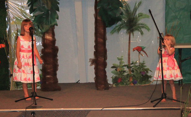 Tara, left, and Erica Schlader took second in the 5-12 year old division of the Two-Minute Talent show. Erica really loved that microphone.