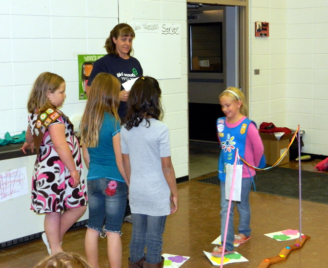 2nd year Junior Girl Scout Ciara Chaffee is waiting at the end of the crossing over bridge to greet Madison Shears, Audrey Drake, Leann Lightfield and Rachael Gimmeson as 1st year Junior Girl Scouts. Leader Heather Lightfield is leading the ceremony.