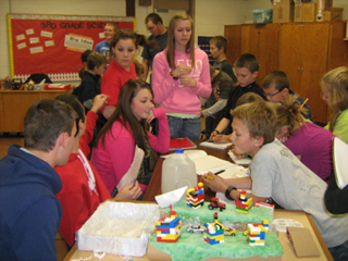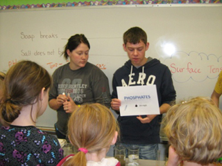 The Natural Science students, a group composed of 20 tenth, eleventh and twelfth graders, recently traveled down to our elementary school to teach the fourth grade students about water quality. As part of their curriculum, Natural Science students complete a stream study on 3 different water bodies that compose the same water system; Fish Creek that flows into Whitebird Creek that flows into the Salmon near Hammer Creek campground. During the high school’s stream study, the students checked for the overall quality of the water including its pH, dissolved oxygen, phosphates, nitrates, temperature, and turbidity levels to see if this water system was a good habitat for fish to live in. When those same students traveled down to Mrs. Kim Schumacher’s fourth grade science class, they then had to teach the elementary students what each of those components were, how to test for them, and what good ranges were for the upcoming spring release of their salmon. High school students were required to not only teach the students about each of these parameters but also incorporate a hands-on experiment for those students to perform. Overall, both the high school and the elementary school students seemed to have a great time and learn quite a bit from each other.