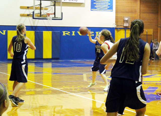 Sarah Chmelik, 10, has just passed the ball to Rachel Frei, partially hidden, as Megan Seubert watches during Summit’s game against Council at Riggins on Saturday. Photo by Rose Frei. Boys team wins 1 of 3 The Summit Patriots opened their season with a win at New Meadows and then lost to C.V. and Lapwai at the Lapwai Tournament last week. They eased off on the pressure in the second half and still managed to outscore Meadows Valley 17-10. Meadows Valley was getting nothing inside against Summit as 3 of their 6 baskets were from 3-point range. Michael Waters led the scoring for Summit with 14 points with Josh Lustig scoring 11 and Thomas Schwartz and Dean Stubbers 10 each. Shane Stubbers added 8 points with Matthew Schwartz scored 4 and Nathan Beckman 2. Summit 21 21 12 5 -59 M.V. 0 5 8 2 -15 Summit-T. Schwartz 5, 0-0, 10; Lustig 5, 1-1, 11; S. Stubbers 4, 0-0, 8; D. Stubbers 3, 4-4, 10; Beckman 1, 0-0, 2; Waters 7, 0-0, 14; M Schwartz 2, 0-0, 4. 3-pointers-none. M.V.-D. Gregerson 3, Nolder 0, Smith 3, Sletton 0, Day 0, Keene 0, G. Gregerson 0, Harmon 0, Roberts 7, Shen 2. 3-pointers-D. Gregerson, Smith, Roberts. In the Lapwai game the Wildcats jumped out to an 8-23 lead after one quarter but the Patriots outplayed the hosts over the next two quarters cutting a 15 point deficit down to 5 by the end of the third quarter. Summit outscored Lapwai 26-20 in the second quarter and 17-13 in the third to cut the margin to 51-56. Lapwai was able to rally in the fourth though and outscored the Patriots 10-32 to pull away for a big win. Lustig led the Summit scoring effort with 19 points with Matthew Schwartz scoring 17, Waters 13, Shane Stubbers 7 and Beckman 5. Schwartz and Beckman each had a 3-pointer. Summit 8 26 17 10 -61 Lapwai 23 20 13 32 -88 Summit-T. Schwartz 0, 0-0, 0; Lustig 8, 3-5, 19; S. Stubbers 3, 1-2, 7; D. Stubbers 0, 0-0, 0; Beckman 2, 0-0, 5; Waters 5, 3-5, 13; M. Schwartz 7, 2-2, 17. 3-pointers-Beckman, M. Schwartz. Lapwai-Higheagle 6, 1-2, 14; Aripa 4, 1-2, 12; Tannehill 3, 1-1, 9; Chimburas 4, 1-2, 9; Payne 4, 1-6, 9; Calkins 0, 0-0, 0; Bullock 1, 0-0, 2; Penney 3, 6-6, 12; Leighton 7, 2-5, 17; Greene 2, 0-0, 4. 3-pointers-Aripa 3, Tannehill 2, Higheagle, Leighton. Summit trailed just 11-14 after one quarter after jumping out to a 7-0 lead, and 20-25 at the half. C.V. outscored the Patriots 13-23 in the third quarter though and 13-10 in the fourth to pull away for an 18-point win. Waters led the scoring for the Patriots with 17 points with Lustig also hitting double figures with 14 which included a 6 for 6 performance at the free throw line. Matthew Schwartz scored 8, including a pair of 3-pointers, and Dean Stubbers scored 4. Summit has a 1-2 overall record on the season. Summit 11 9 13 10 -43 C.V. 14 11 23 13 -61 Summit-T. Schwartz 0, 0-0, 0; Lustig 4, 6-6, 14; D. Stubbers 2, 0-0, 4; Beckman 0, 0-0, 0; Waters 6, 5-6, 17; M. Schwartz 3, 0-0, 8. 3-pointers-M. Schwartz 2. C.V.-Owens 5, 0-0, 12; Shebala 2, 0-0, 5; Pratt 5, 2-3, 14; Baldwin 0, 0-0, 0; Reed 0, 0-0, 0; Farmer 7, 1-2, 17; Fisher 0, 1-2, 1; Wyman 5, 0-0, 12. 3-pointers-Owens 2, Pratt 2, Farmer 2, Wyman 2, Shebala. 17-Highland Tourney, 10 a.m. or noon, lost to Highland 30-33 27-Meadows Valley, there, 5 p.m. PST, won 33-22 29-Orofino, there, 6 p.m., won 39-18 4-Grangeville JV, home, 7:30 p.m. 6-Nezperce, there, 6 p.m. 11-Highland, there, 7:30 p.m. 13-Deary, home, 6 p.m. 20-Kendrick, there, 6 p.m. 10-Grangeville, there, 7:30 p.m. 11-Deary, there, 6 p.m. 15-Highland, home, 7:30 p.m. 17-Nezperce, home, 6 p.m. 19-Kendrick, home, 6 p.m. 22-Timberline, there, 7:30 p.m. 1/29, 2/1, 2/2, 2/7, 2/8-District at LCSC 2/9-Play-in game at McCall, 2 p.m. MST 2/14-16-State at Nampa High School SUMMIT BOYS BASKETBALL 2012-13 28-Lapwai Tourney vs. Lapwai, 7:30 p.m., lost 61-88 29-Lapwai Tourney vs. C.V., 6 p.m., lost 43-61 6-Nezperce, there, 7:30 p.m. 11-Highland, there, 6 p.m. 13-Deary, home, 7:30 p.m. 15-Salmon River, home, 6:30 p.m. 20-Kendrick, there, 7:30 p.m. 11-Deary, there, 7:30 p.m. 15-Highland, home, 6 p.m. 17-Nezperce, home, 7:30 p.m. 22-Timberline, there, 6 p.m. 26-Logos, there, 5 p.m. 31-Kendrick, home, 6 p.m. 11, 15, 18, 21, 22-District at LCSC 23-Play-in game at McCall, 2 p.m. MST 2/28, 3/1, 3/2-State at Caldwell High School |