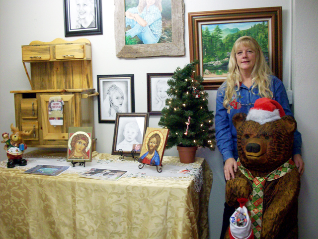 Presenting Artist of the Month, Therese Schmidt. Theresa was born on a ranch near Mason Butte to Herman and Patricia Trautman. Thus began the life of a young lady whose talents never cease and are utterly amazing. Therese began drawing at the young age of 10 and remembers painting three pictures. Then about 13 years ago she picked up the pencil and began drawing once again under the direction of local artist, Ladd Arnoti. She remembers Ladd saying “draw more, you should draw more”. She later took a drawing class at L.C.S.C. for one year and a Sculpture class of the U of I for one semester. Thus began a love affair with the world of art. Having become the wife of dairy farmer, Ted Schmidt, her time was very limited and prevented much activity as an artist at this time. Having now retired from dairy life, they continue to farm and raise cattle. They also own a portable saw mill and do custom wood cutting. They have six children and twelve grand children. Being involved in the Mystery Night activities, Therese started decorating for the event through her paintings, considering it a donation for God. This allowed her to overcome the fear of not doing it perfect. She says “it helped me“. “He puts the image in my mind and I do it“. “He is the Artist“. Her interests are in photography, pottery, oil paintings, charcoal, landscapes, and drawing but her favorite is portraits. This is evident by her display of family portraits in the library. They can also be found in California and Colorado as well as Idaho. Her least favorite is painting on glass. Recently she discovered the fun of chain saw bear sculptures. It can be frustrating, she admits. However each log takes on its own personality. Ted helps with the first cuts and Therese does the details. One larger bear is on display in the library at this time and for anyone interested, may order one custom made to suit their décor. The most enjoyable of her talents is (praying) or writing an Icon. When asked to describe an icon, her answer was “It is a set pattern, a window to heaven, God coming through speaking to his people. There is no shadow on the face. It is a spiritual writing, not meant to be artistically pleasing but to cause meditation on what God is speaking through the icon. There is no eye reflection but light coming from within. It symbolizes different things in the spiritual world. The artist is first to pray before the Icon“. Her favorite pastime is drawing and praying along with spending time with grandchildren.