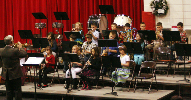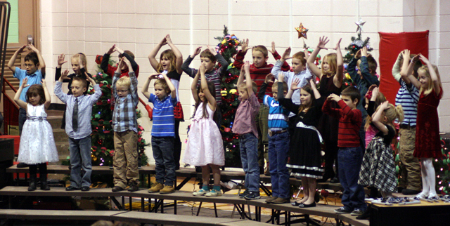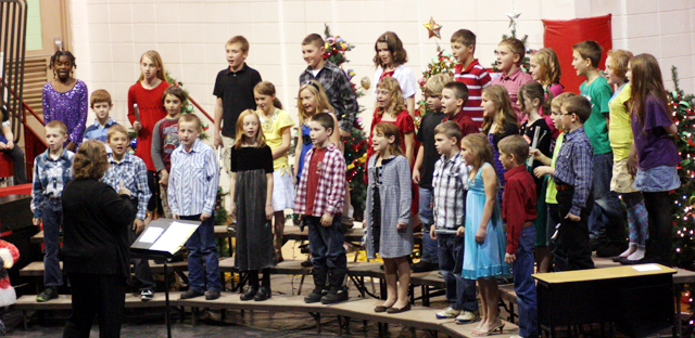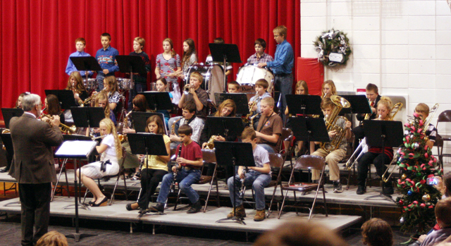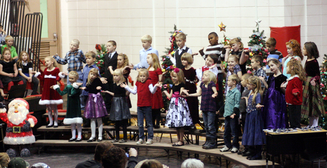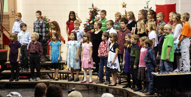 From the top down are the Kindergarten, 1st Grade, 2nd Grade, 3rd Grade and 4th Grade classes singing and the 5th Grade and 6th Grade Bands.