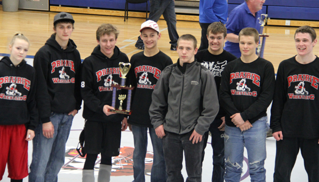 The Prairie Wrestling team is shown with the second place team trophy at the Orofino Tournament. Saturday, Jan. 12 at Orofino the Prairie wrestling team finished runner up as a team with 4 individual champions. Tyler Ross, Tayler Heitman, Alex Duman and Kade Perrin were the individual champions while Hunter McWilliams placed 2nd, Dally Ratcliff placed 3rd and Kellie Heitman placed 4th. Shown from left are Kellie Heitman, Tayler Heitman, Alex Duman, Tyler Ross, Hunter McWilliams, Dally Ratcliff, Dillon Matson and Kade Perrin. Photo provided by Pat McWilliams. PIRATES WRESTLING SCHEDULE FOR 2012-13 JANUARY 22-C.V., there, 6 p.m. 25 & 26-New Plymouth Tourn. TBA 29-Grangeville, there, 6 p.m. 15 & 16-Districts, here 22 & 23-State at Pocatello |