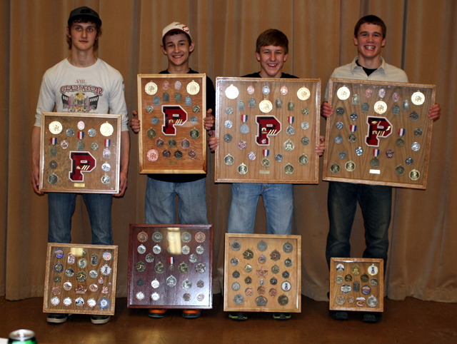 Each year the seniors on the Prairie wrestling team receive a shadow box displaying all their medals earned. From left are Tayler Heitman, Tyler Ross, Alex Duman and Kade Perrin. Photo by Cheryl Gimmeson.