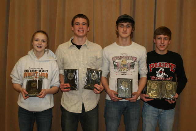 Wrestling awards were given out last week. Shown from left are Kellie Heitman, first female wrestler from District 1-2 to go to State; Kade Perrin, co-captain and most inspirational; Tayler Heitman, most improved and Alex Duman, co-captain and most outstanding. Photo by Cheryl Gimmeson.