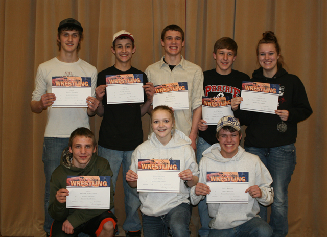 Each member of the Prairie wrestling team received a certificate of recognition from Prairie High School. Back from left are Tayler Heitman, Tyler Ross, Kade Perrin, Alex Duman and Tannor Ratcliff. Tannor was the team stats keeper. Front from left are Hunter McWilliams, Kellie Heitman and Dally Ratcliff. Photo by Cheryl Gimmeson. |