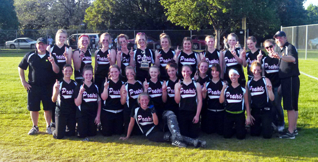 Wilson led off with a walk but was caught stealing. Danly followed with a 4-pitch walk. Schlader then doubled to right center with Danly going to third. Danly had to hold up as there was a chance the ball might have been caught. Nuxoll then singled home both runners for a 2-0 Prairie lead. Genesee bounced back with a run in the bottom of the first on a walk with the batter advancing to third on a pair of pitches that got past the catcher. She then scored on a sacrifice fly. In the second Genesee tied it with 3 singles. Genesee took the lead in the third with an infield single, sacrifice and another single. That would be the final run for the Bulldogs who would put runners on in the fourth, fifth and sixth but nobody made it past second thanks to the Prairie defense. Prairie had opportunities to score in the second, third and fourth innings but couldn’t get the key hit to get the runners home. They kept pounding the ball to the infielders for forceouts at second. In the fifth they got a big break with a couple of errors. Wilson led off by reaching on a throwing error by the third baseman, who had played stellar defense to that point. Danly then blooped a single to short right field. Schlader grounded a ball back to the pitcher but she couldn’t find the handle on the ball and the bases were load. After a strikeout, Schumacher drew a bases loaded walk to tie the game as Wilson scored. Rieman then drew another bases loaded walk to put Prairie ahead 4-3. At that point Genesee changed pitchers and Holthaus greeted her with a bunt single that saw Schlader scoring from third. Amanda Dinning followed with a bloop hit over third that scored Schumacher to make the score 6-3. Prairie had a chance to add on in the sixth as Wilson and Danly each singled to start the inning. A grounder to third forced Wilson and a couple of fly balls got Genesee out of the jam. Meanwhile Holthaus gave up just 2 baserunners over the final 3 innings. She got the third out on a pop-up after a 2-out single in the fifth. After a leadoff walk in the sixth Schlader snagged a line drive at shortstop and with a better throw would’ve doubled the runner off first. The next two hitters both flew out to Nuxoll in left field. In the seventh she got the side out in order to end the game. Prairie had 11 hits in the game with Dinning collecting 3 singles and an RBI. Danly and Wilson had 2 singles each while Schlader had a double. Nuxoll had a single and 2 RBI. Schumacher and Holthaus each had a single and 1 RBI. Holthaus allowed 8 hits, all singles, with 2 walks and 2 strikeouts. Prairie takes a 15-4 record into the State Tournament which starts this Friday at noon at Airport Park in Lewiston against Greenleaf. Genesee beat Troy in the second place game and will play Horseshoe Bend, also at noon Friday. Prairie 2 0 0 0 4 0 0—7 11 0 Genesee 1 1 1 0 0 0 0—3 8 3