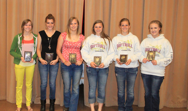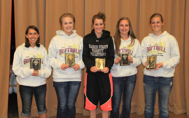 Prairie softball award winners are shown. From left are Krista Hess, most improved; Kendall Schumacher, most inspirational; Leah Holthaus, defensive player of the year; Hailey Danly, offensive player of the year with an even .500 batting average; and Tanna Schlader, best all-round player.