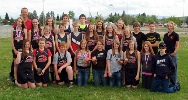 The 2013 Prairie Junior High Track Team and coaches. Front from left are Sydney Bruner, Alexis Shears, Dereck Arnzen, Kylie Tidwell, Samantha Remacle, Tiffany Sonnen, Bailie Gehring, Josie Peery and Noah Arnzen. Middle from left are Delaney Uhlenkott, Nathan Gimmeson, Tyson Schlader, Trista Latimer, Sierrah Poxleitner and Leah Higgins. Third row from left are Kori Pentzer, Nicole Poxleitner, Chaye Uptmor, Anthony Karel, Hunter Chafee, Mykaela McWilliams, Alli Hale, Raice Dalgliesh, Brandon Anderson and assistant coach Tabitha Roach. In back is head coach Glenn Poxleitner. Photo by Shellie Schlader.