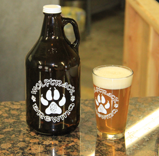A half-gallon sized Wolf Track Brewing 'Growler' and a pint glass full of beer. |