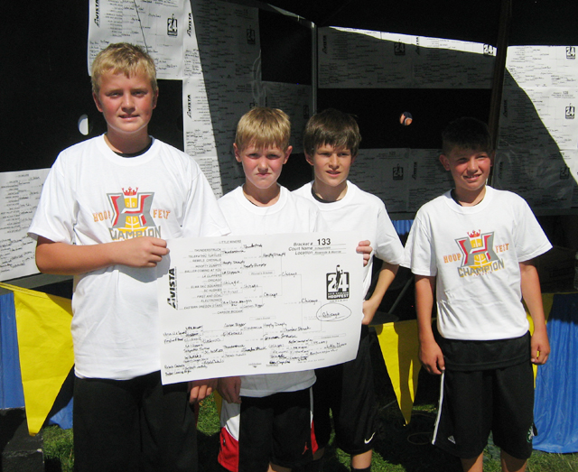 Spencer Schumacher, Dylan Schumacher, Devin Ross, and Derik Shears wearing their Hoopfest Court Champions t-shirts and showing off their championship bracket. Hoopfest was held this past weekend in Spokane. Photo by Kim Schumacher. |
