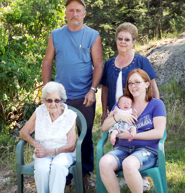Edna Johnston. Standing from left are Grandpa Rusty Lorentz and Great Grandma