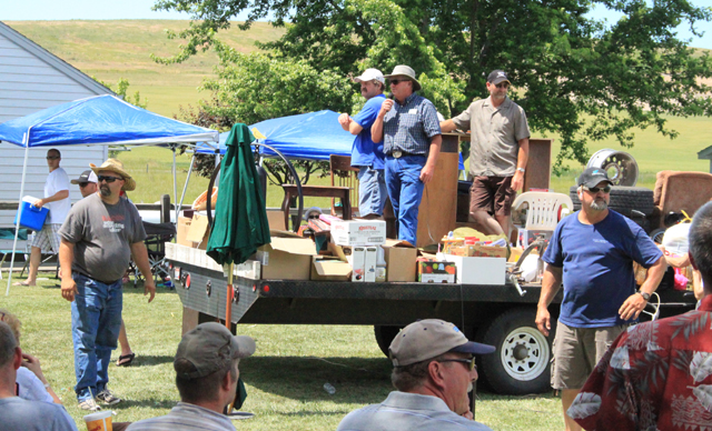 John Schumacher serves as auctioneer with Tony, Don and Tim Schumacher and Aaron Hinkelman serving as spotters during the Greencreek 4th of July celebration auction.