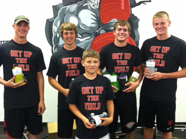 The Prairie Pirate Football team concluded a very successful off-season training regimen this Thursday by competing in another Team Testing Day, which is known in the football realm as a "Combine". There was a great showing of 25 athletes, and each of them performed admirably. Awards were given out for the winners in each event, including the 40 yd. dash (the Fastest Pirate Award), the 3-Cone drill (Agility Award), the Shuttle drill (Shuttle Master Award), the broad jump (Bullfrog Award), and the bench press (Strongest Pirate Award). A final award is given to the best overall performance (the Combine King). This Combine's awards were won by, from left to right, Lucas Arnzen (Shuttle Master Award), Westin Crenshaw (Fastest Big-man Award), Derik Shears (Rookie Award), Isaiah Shears (Fastest Pirate Award, Strongest Pirate Award, Agility Award, and the Combine King), and Jake Bruner (Bullfrog Award). Practice for the Pirates begins Monday, Aug. 19th, at 7:00 pm. Remember to come out and support the team as they take on Salmon River for their first game in September!
